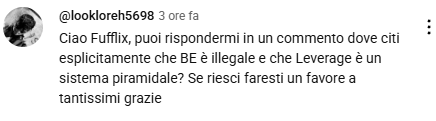 E dunque, da ora in avanti, spieghiamo a questo utenti (magari in buona fede, magari mandato a tendere una "trappola"), perché non serve definire esplicitamente "BE" illegale e/o Levarage "uno sistema piramidale". Basta porre domande e leggere le (non) risposte, usando la propria capacità critica, per rendersi conto di chi e costa stiamo parlando.