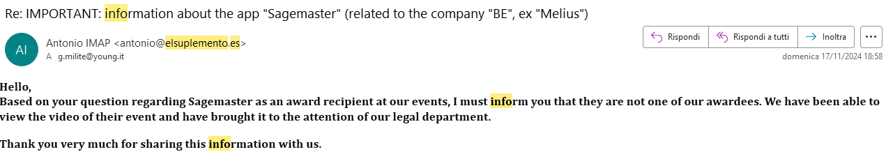 Orbene, leggete sotto questa eloquente mail di risposta dagli organizzatori del premio citato durante questa conferenza di "BE" (ora Better Experience), ai quali ho semplicemente chiesto conferma:"Ma è vero che avete premiato Sagemaster?"
