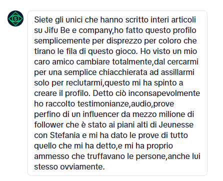 - Fate la stessa domanda per i leader italiani come Giorgio Trabaldo, Matteo Bianco, Luis Marishta ecc: che cv professionale verificabile hanno, questi ragazzi? Da dove vengono? Come hanno fatto soldi? Costruendo reti in progetti poi magari implosi? A parte proporre affiliazioni e reclutare, cosa hanno fatto nella vita? Cosa possono insegnare sul serio a chi li ascolta? E da cosa guadagnano, oggi?