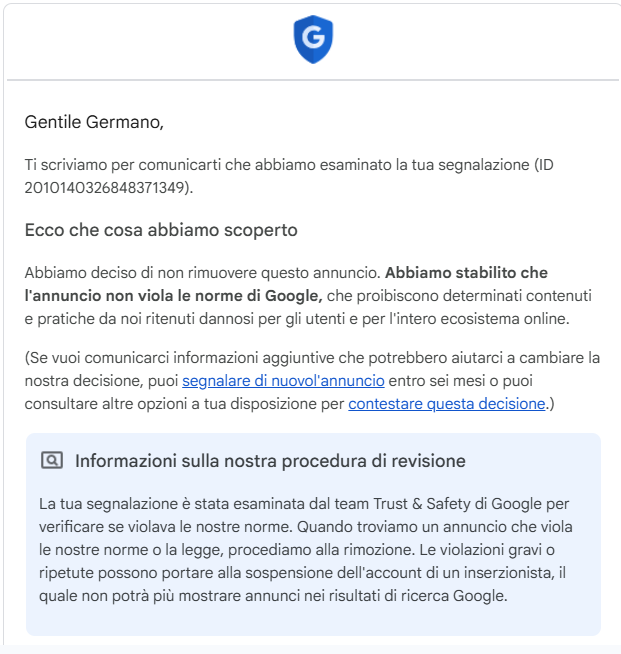 Speranza per lo più vana, perché in realtà Google ci conferma che dopo il controllo non rimuoverà nulla, visto che nulla risulta fuori posto. Addirittura ci sarebbe un team "Trust & Safety" dedicato al controllo delle inserzioni. Sarà un team composto da sordociechi? Perché altrimenti la decisione che leggete sotto non si spiega.