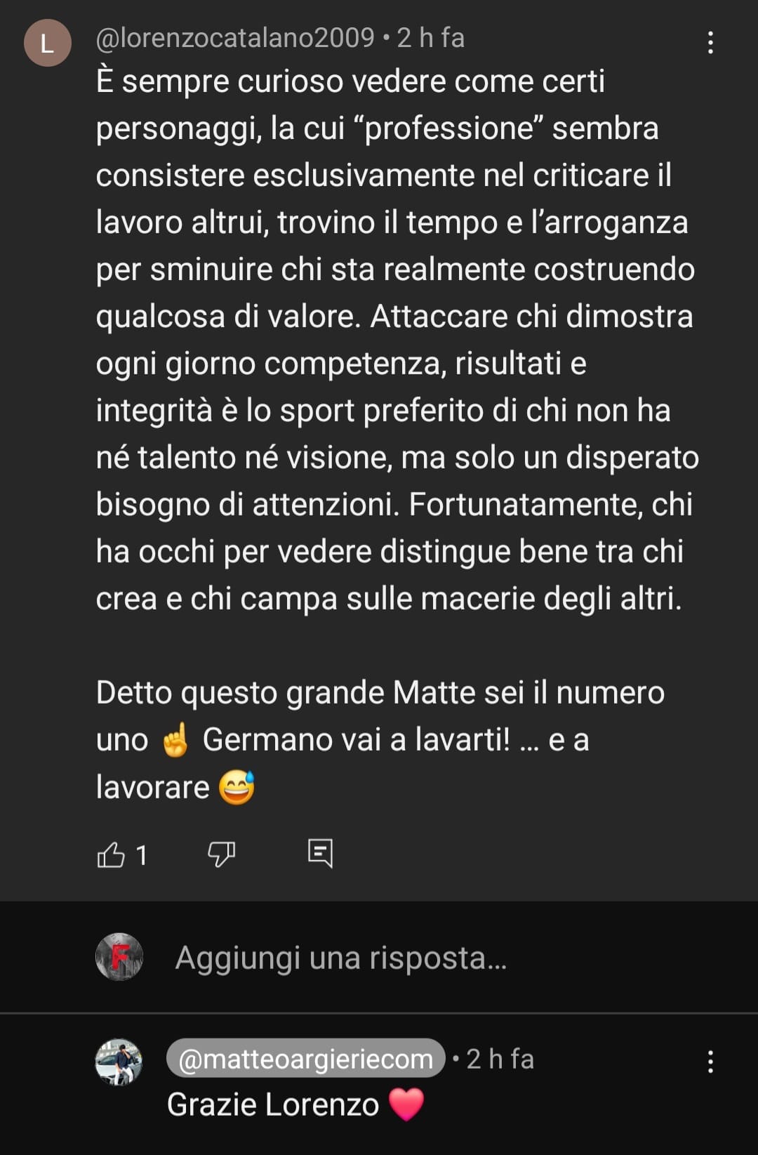 In particolare lascia sgomenti il commento di tale "Lorenzo Catalano", che dopo avermi diffamato sul piano professionale, mi invita ad andare prima a lavarmi e poi a lavorare. Con il sensibilissimo e pacatissimo Argieri che risponde:"Grazie Lorenzo", aggiungendo un cuore. Ma, come? La mia è una community tossica che banni preventivamente e poi nella tua ringrazi chi offende in questo modo?