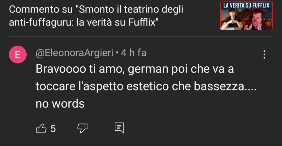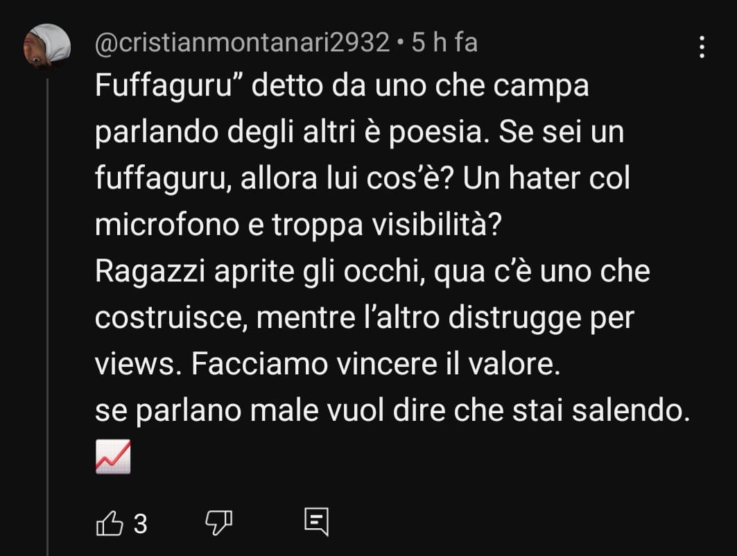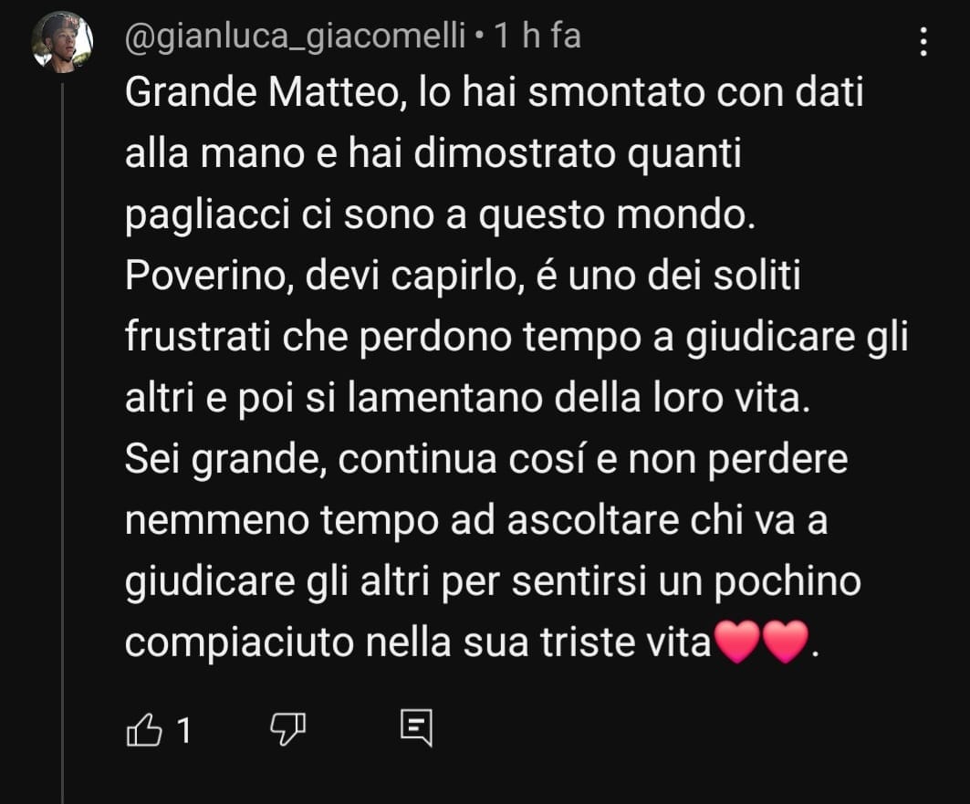 Ecco, il primo errore di comunicazione marchiano del buon Matteo è proprio questa incoerenza tra il tono pacato, educato e pure rispettoso che ha per praticamente tutto il video, la copertina, il titolo del filmato e soprattutto i commenti gravemente insultanti nei miei confronti (che vi mostro poco sotto) che lui ha personalmente approvato, praticamente applaudendoli. Il tutto, dopo essersi lamentato per un paio di innocue battute fatte dalla mia chat durante la live dove lo criticavo (al solito: gli insulti agli altri vanno bene, quelli a te sono lesa maestà).